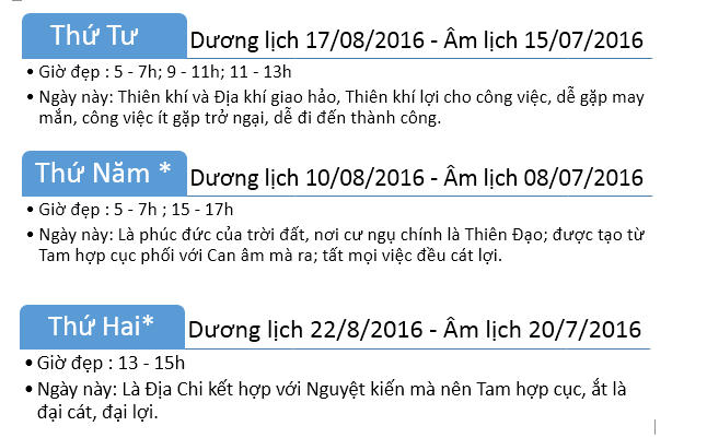 Lưu ý : Trong tháng 8/2016 có 3 ngày đẹp nhất là 8/8/2016, 18/8/2016, 22/8/2016 là 3 ngày đẹp nhất, bạn có thể tham khảo và lựa chọn phù hợp. Vì ngày đẹp còn phụ thuộc vào tuổi của gia chủ.