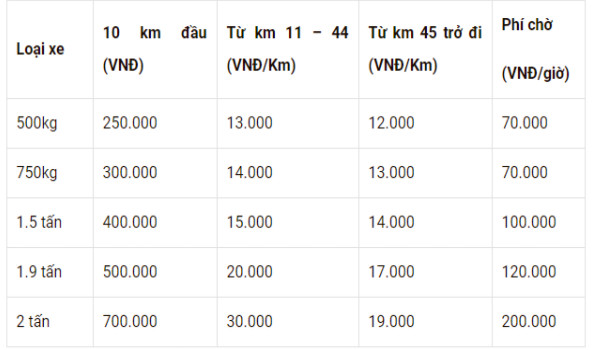 - Xe tải 1.9 tấn: 600.000đ/xe.